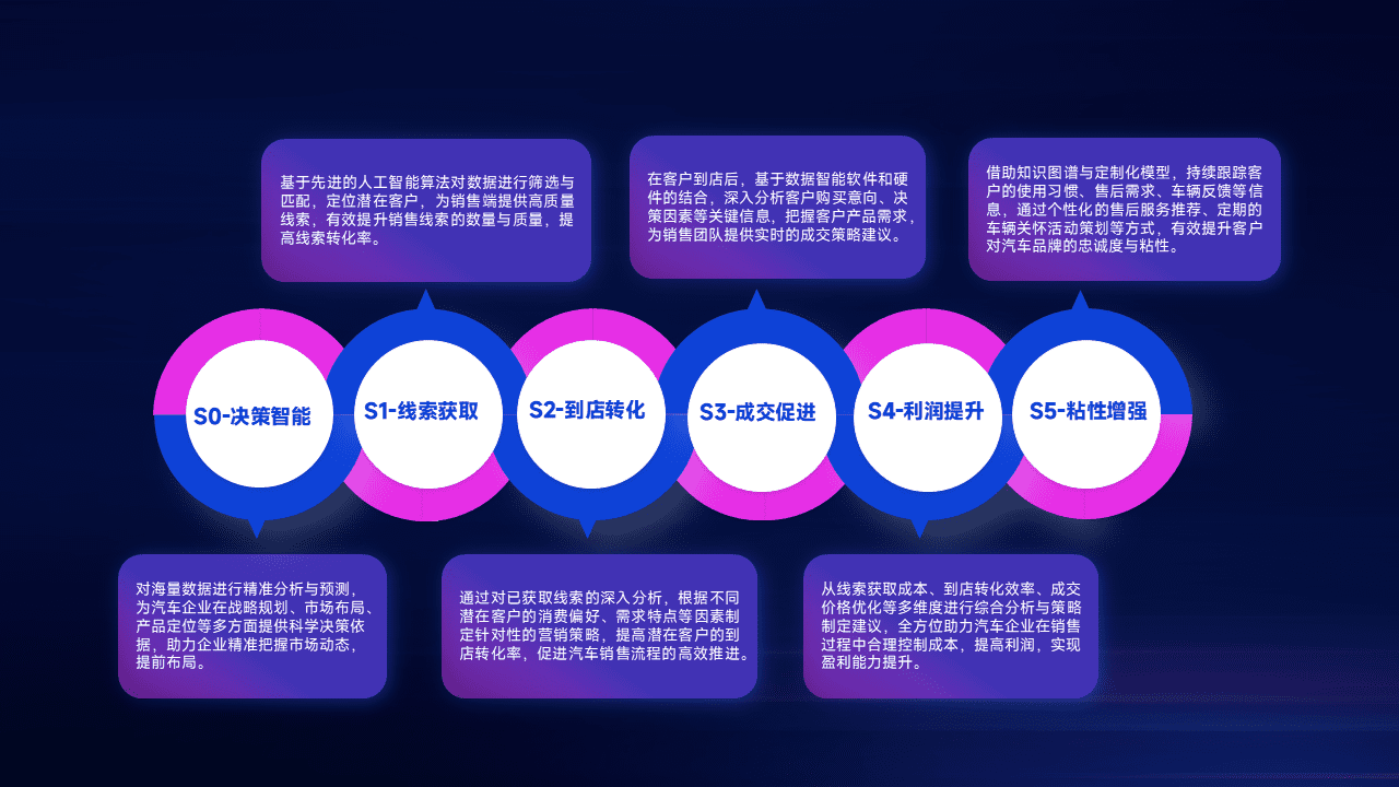 通过拓宽潜在客户来源、、优化线索分配并提高到店转化率,,,以增强销售效率。。。。同时,,,利用线索数据不断优化分析模型,,,有效提升转化率,,扩大营销影响力。。。。